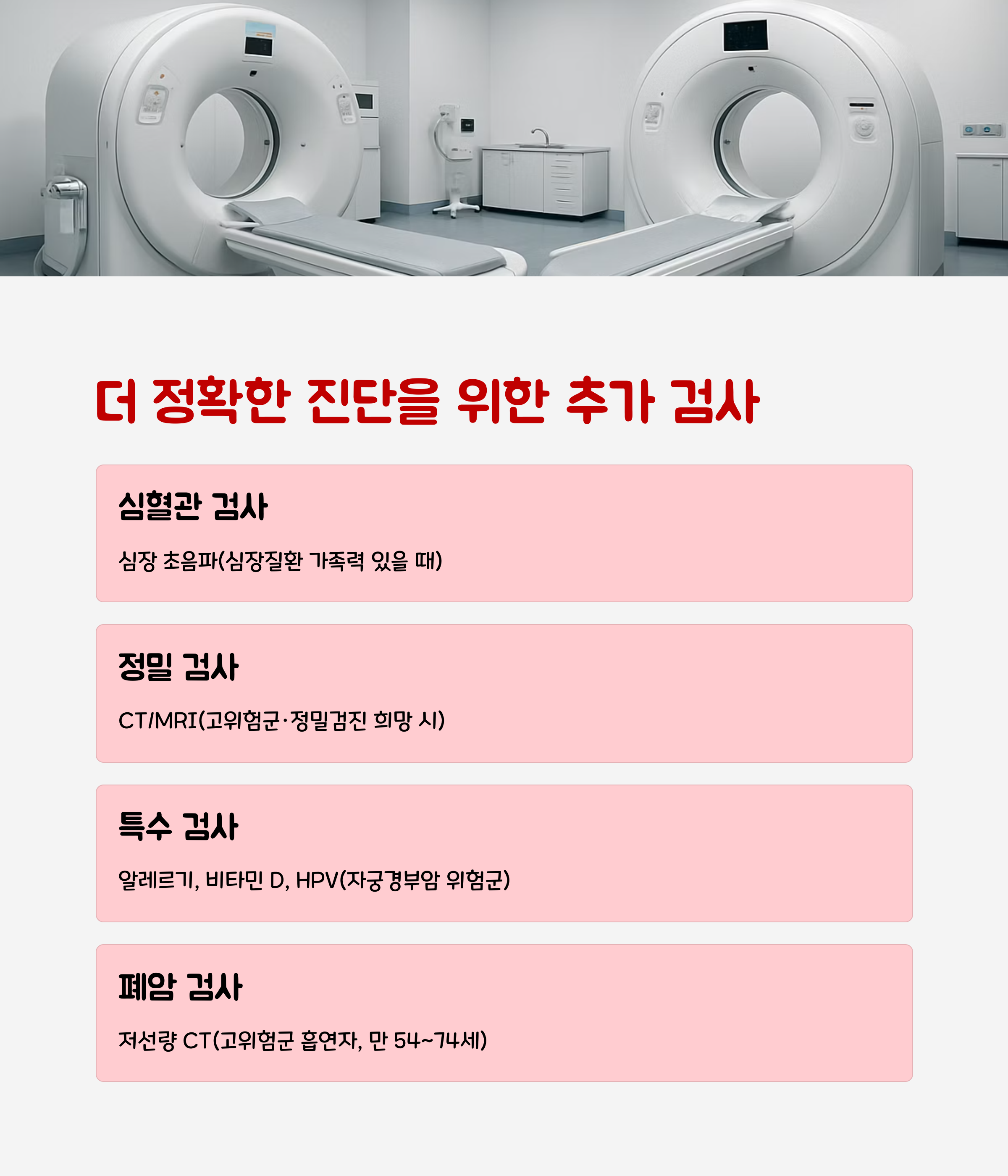 MRI, CT, 유전자 검사 등은 선택사항이지만 가족력이나 본인의 건강상태에 따라 적극 고려해볼 수 있어요. 조금 더 자세하게 건강 상태를 들여다보고 싶다면 추가 검사를 추천드려요!