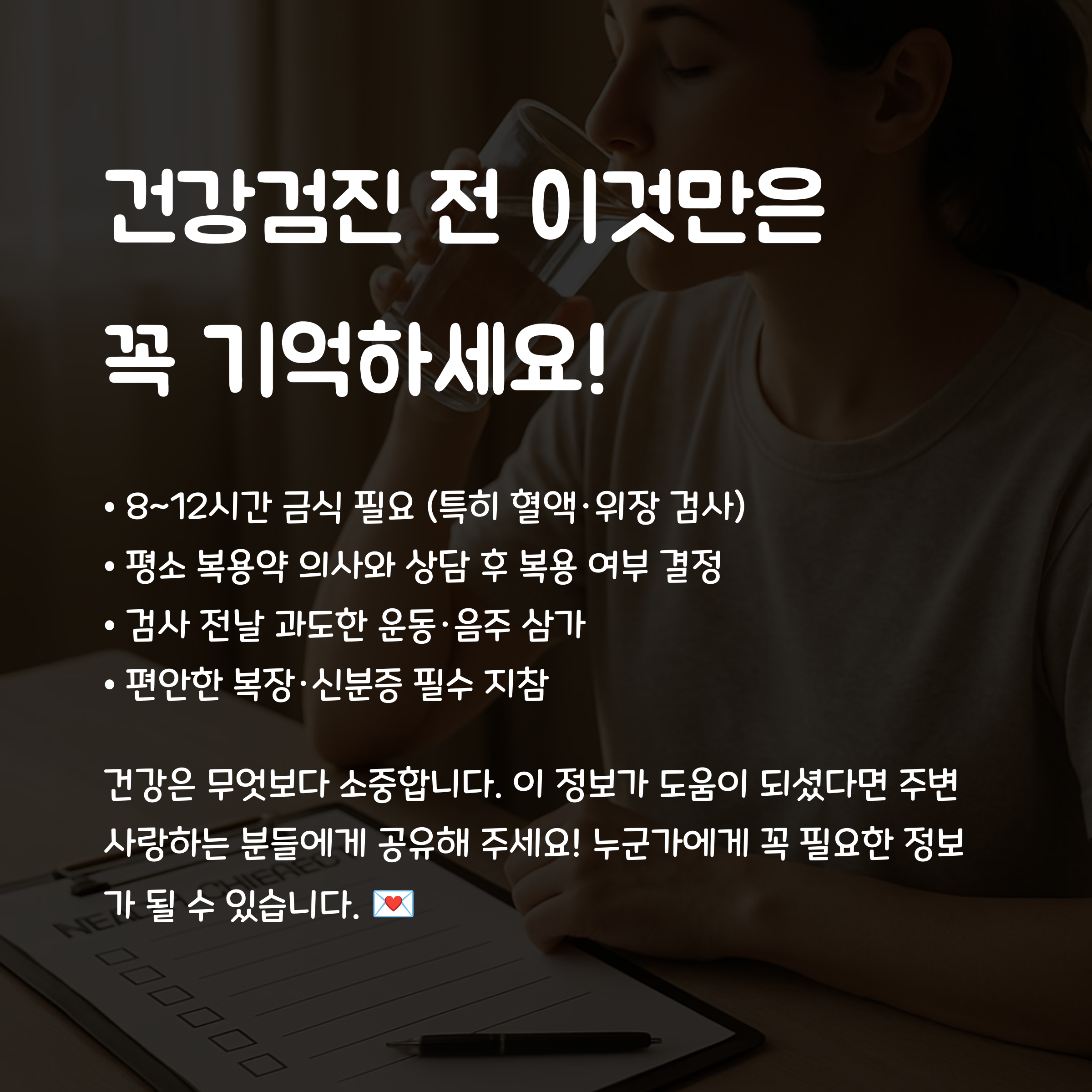 검진 전날 금식, 평소 복용 약은 의료진과 상담 후 조정, 충분한 수면, 그리고 편한 복장 준비! 이 기본만 지켜도 검진 당일 훨씬 수월하게 진행할 수 있어요. 편안한 마음가짐도 잊지 마세요!