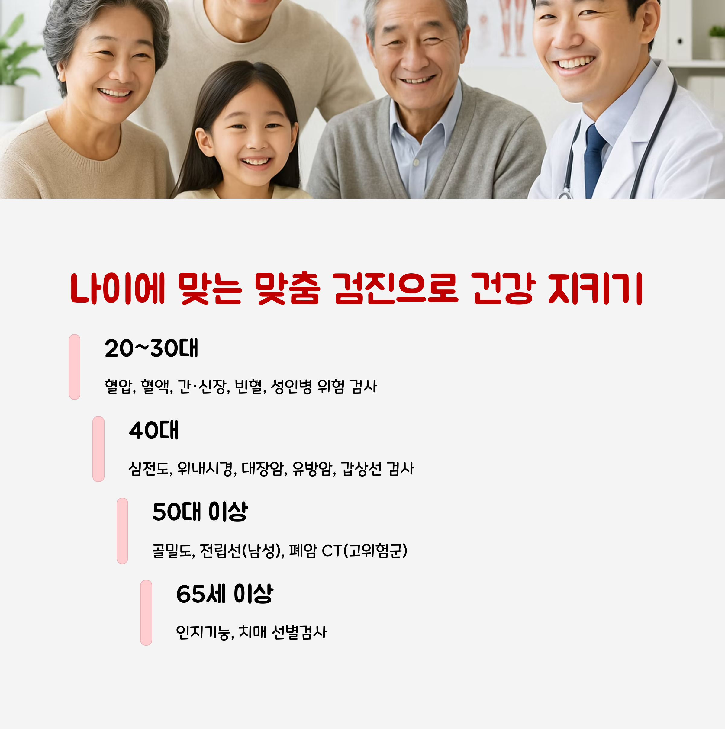 연령대별로 필요한 검진 항목이 달라요. 30대부터는 위내시경, 40대 이후에는 대장내시경, 50대 이후에는 심장 초음파도 고려해야 해요. 나이에 맞는 검진을 받으면 더욱 건강을 오래 지킬 수 있답니다!