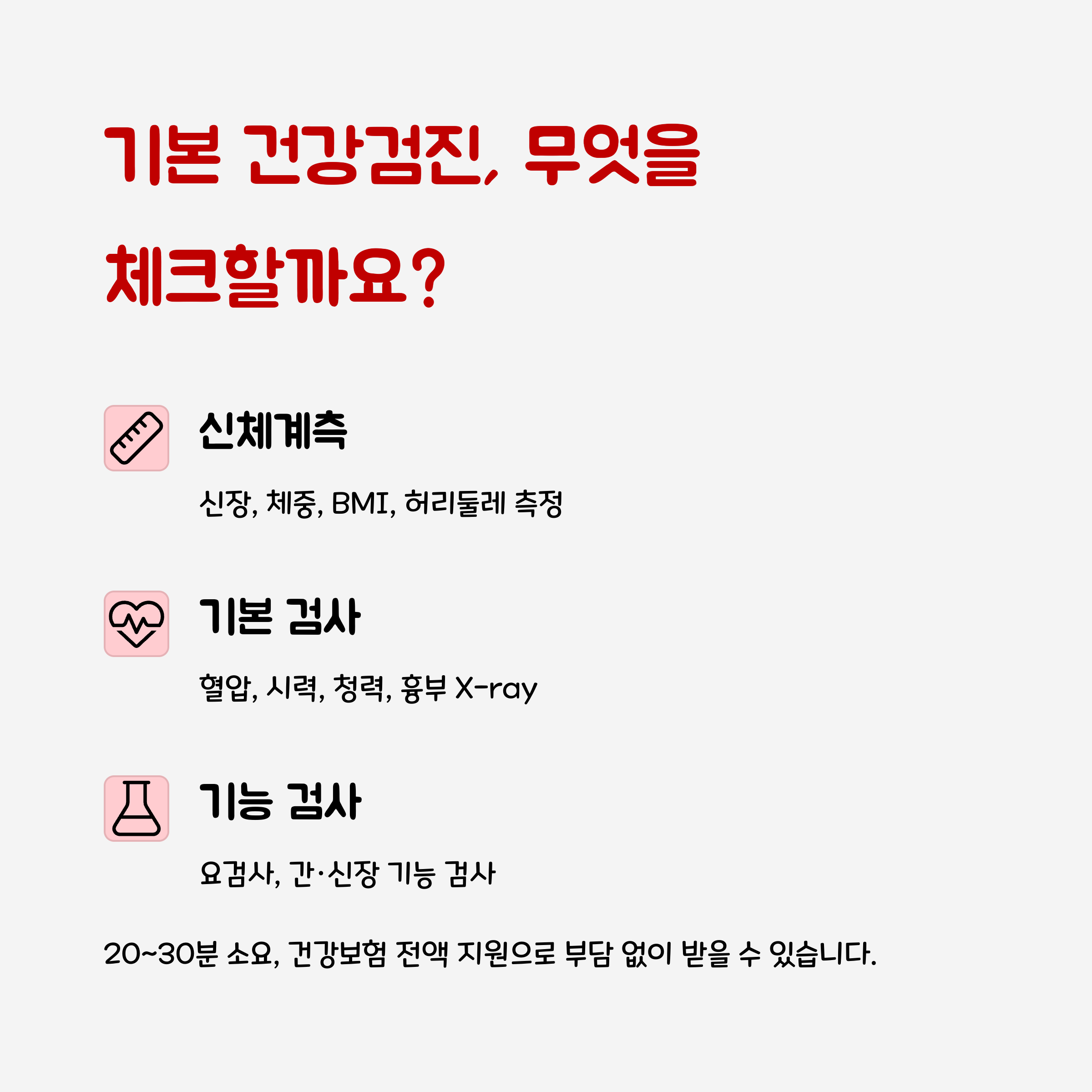 기본 건강검진은 신장, 체중, 혈압, 시력, 청력, 흉부 엑스레이 등이 포함돼요. 특히 혈압과 비만도 체크는 각종 질환 예방의 출발점이 되기 때문에 꼭 받아야 해요. 간단하지만 중요한 검사들이니 빠짐없이 챙겨주세요!
