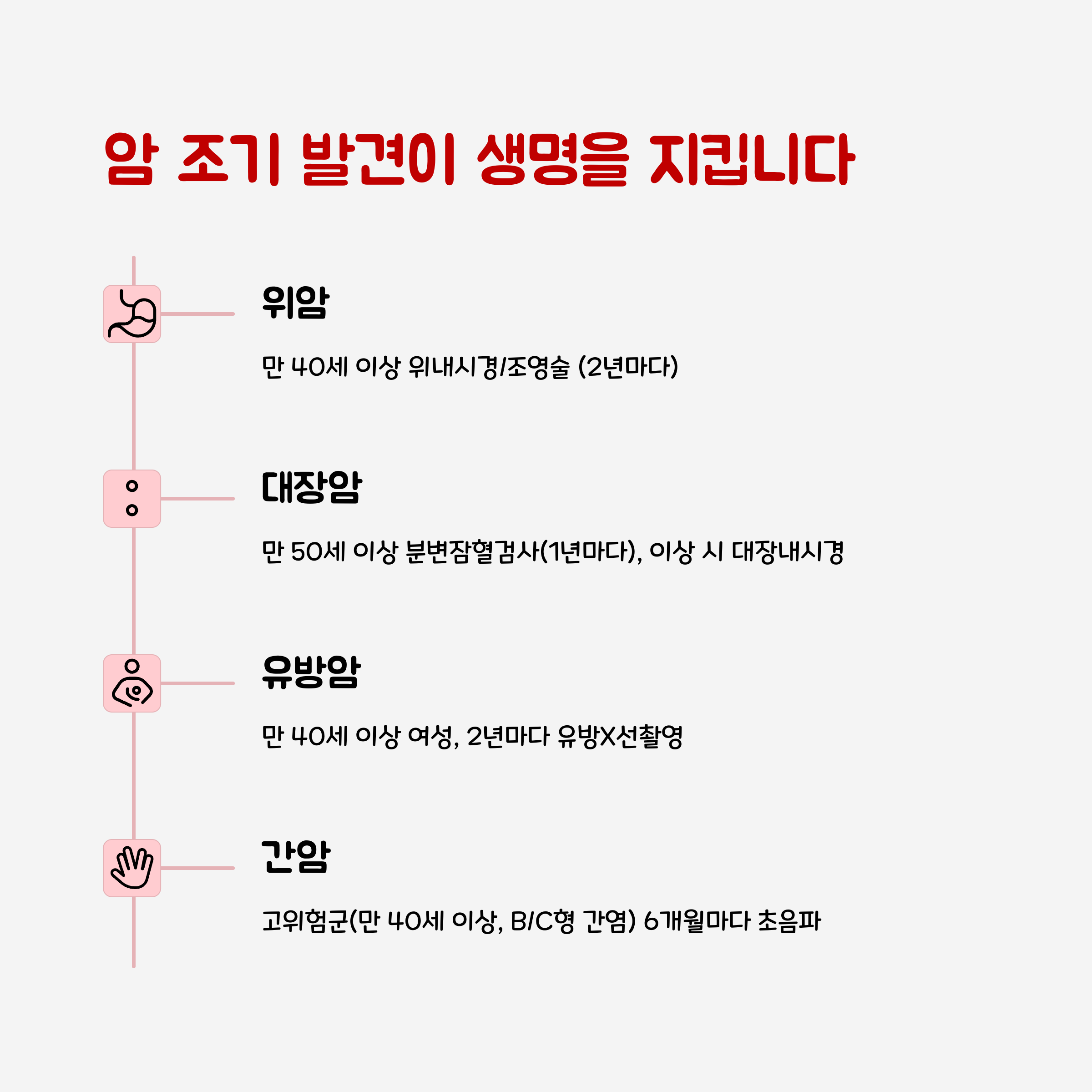 암은 조기 발견이 정말 중요해요. 국가에서 지원하는 5대 암(위암, 대장암, 간암, 유방암, 자궁경부암) 검진은 정기적으로 꼭 받는 게 좋아요. 간단한 검사로도 생명을 지킬 수 있다는 걸 꼭 기억하세요.