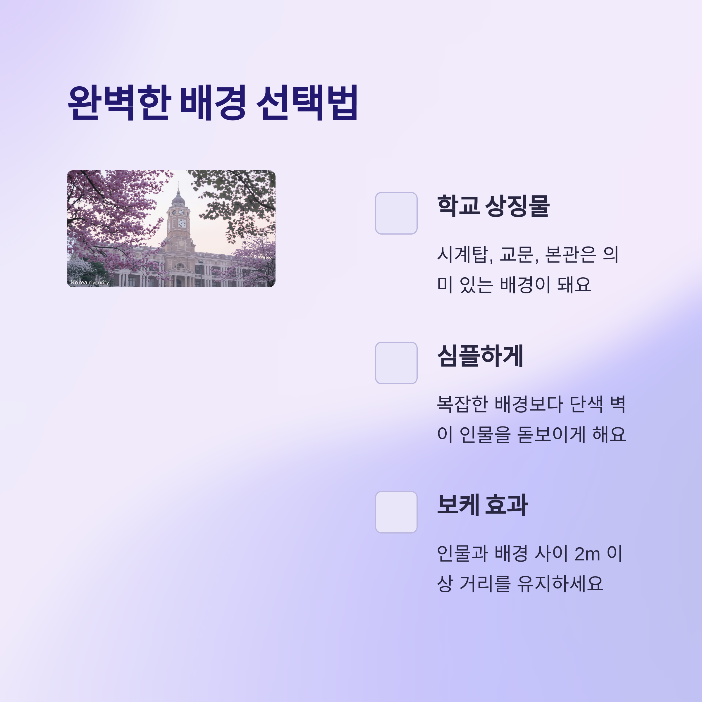 학교 전경, 교문, 벚꽃 나무, 강당 무대 등 상징적인 곳을 배경으로 찍으면 좋아요. 단, 배경이 너무 복잡하거나 사람이 많을 경우는 조금 비켜서 깔끔한 곳을 찾아보세요! "심플한 배경 + 주인공" 조합이 진리입니다. ✨