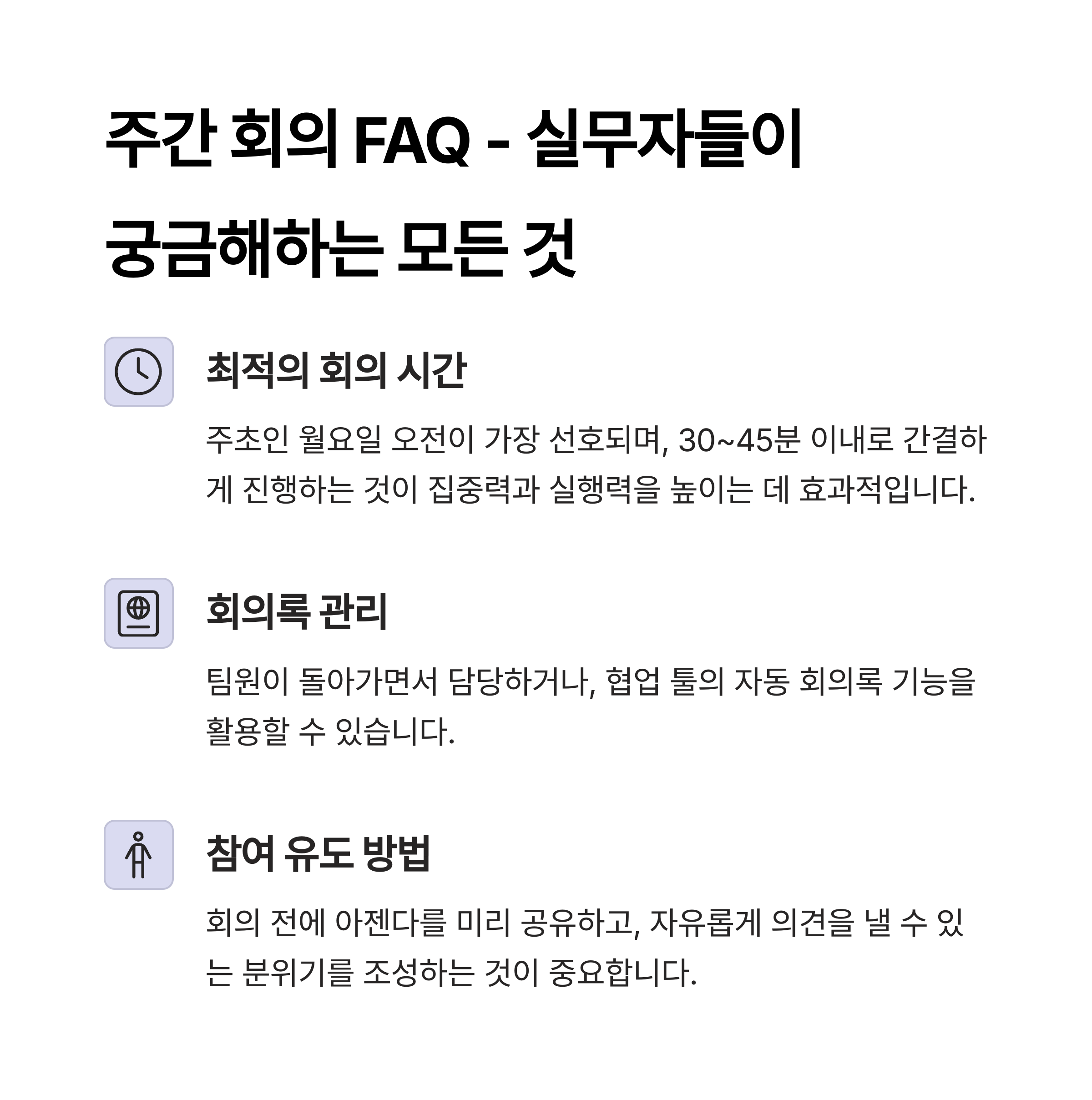 보통 주초인 월요일 오전이 가장 선호되며, 계획 수립과 동기 부여에 적합해요. - 회의는 얼마나 길게 해야 하나요?