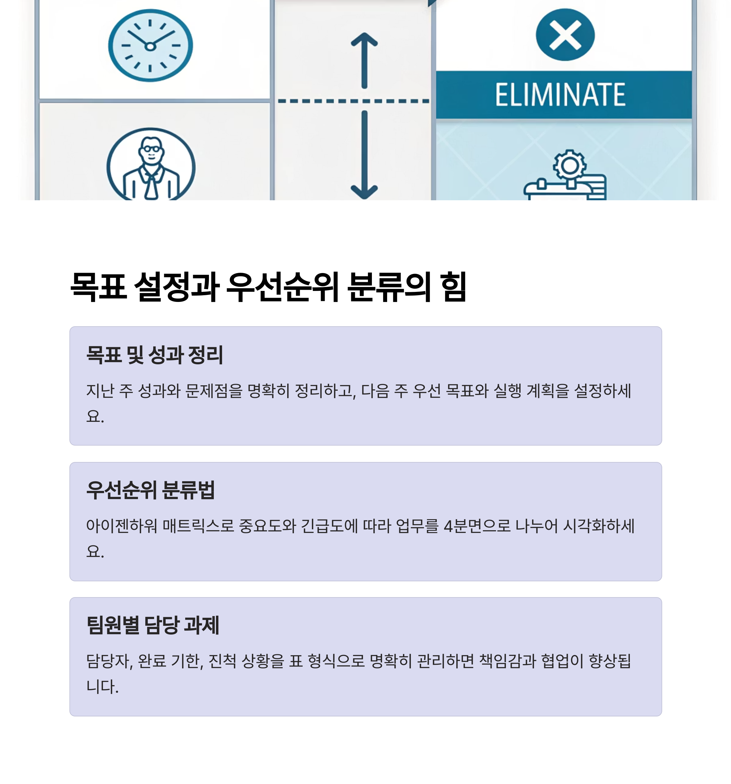 업무의 우선순위를 분류할 때는 중요도와 긴급도를 기준으로 분류하는 것이 좋아요. 대표적인 프레임워크는 '아이젠하워 매트릭스'로, 회의 때 주요 업무를 4분면으로 나눠보면 서로의 시급성과 비중을 쉽게 확인할 수 있답니다. 시각화가 가능하면 구성원 간 공감대도 빠르게 형성돼요.