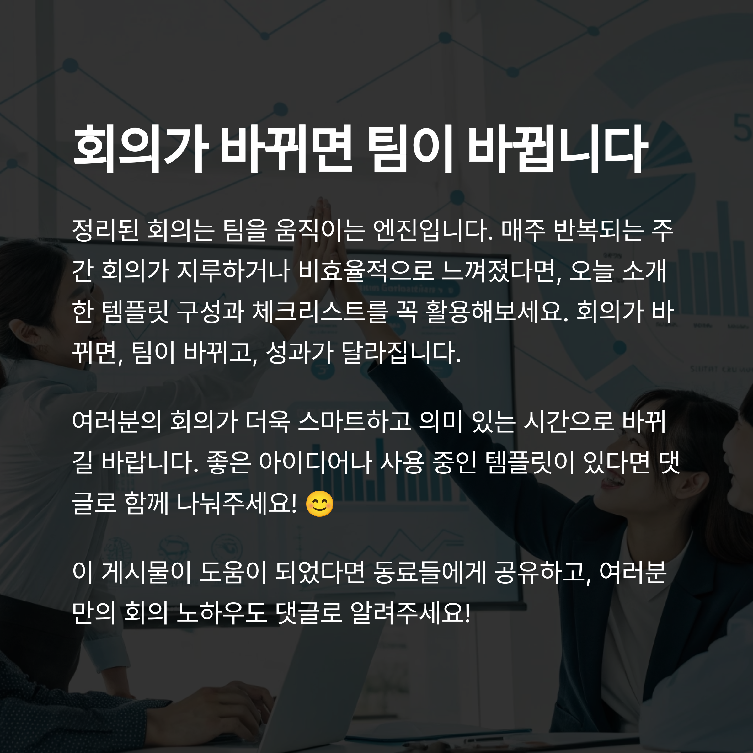 정리된 회의는 팀을 움직이는 엔진이 됩니다. 매주 반복되는 주간 회의가 지루하거나 비효율적으로 느껴졌다면, 오늘 소개한 템플릿 구성과 체크리스트를 꼭 활용해보세요. 회의가 바뀌면, 팀이 바뀌고, 성과가 달라집니다. 여러분의 회의가 더욱 스마트하고 의미 있는 시간으로 바뀌길 바라며, 좋은 아이디어나 사용 중인 템플릿이 있다면 댓글로 함께 나눠주세요! 😊